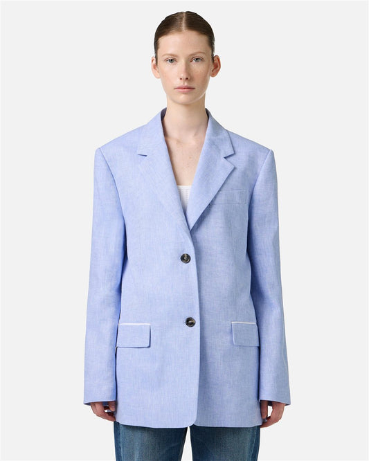 Chaqueta azul de corte relajado con botonadura sencilla en tejido de mezcla de lino en diagonal