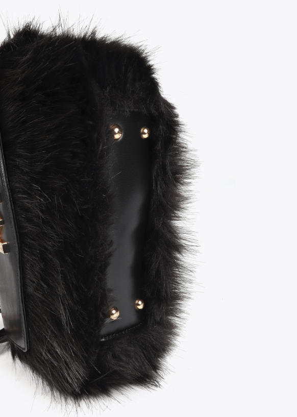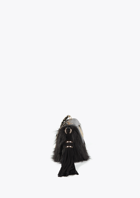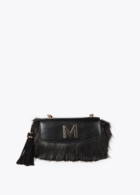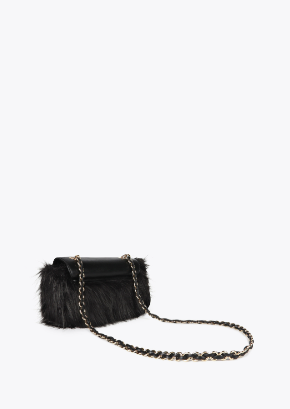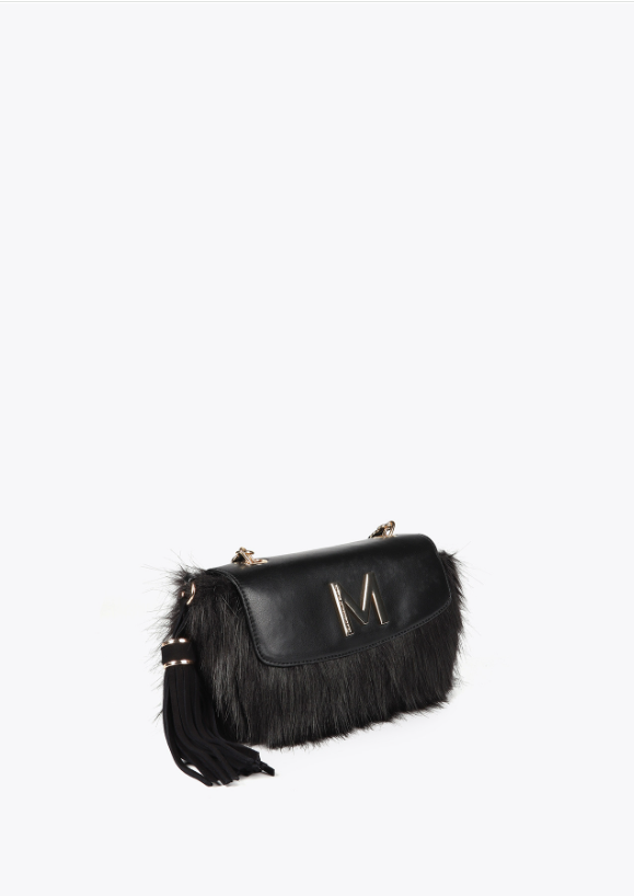 Bandolera sofisticada con solapa efecto piel y detalle de pelo. Cadena dorada combinada y cierre magnético. Incluye logotipo metálico en la solapa. Interior con compartimentos y un bolsillo con cremallera.