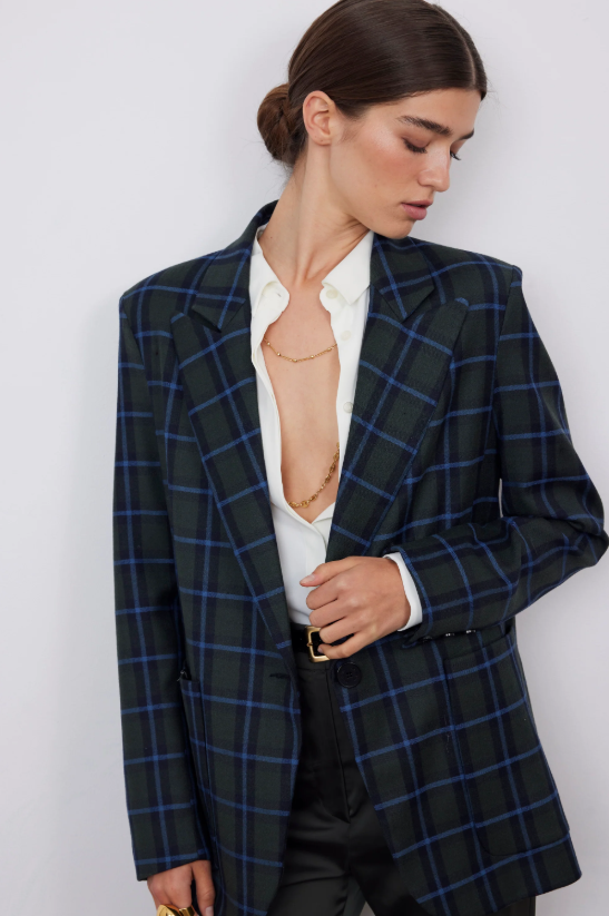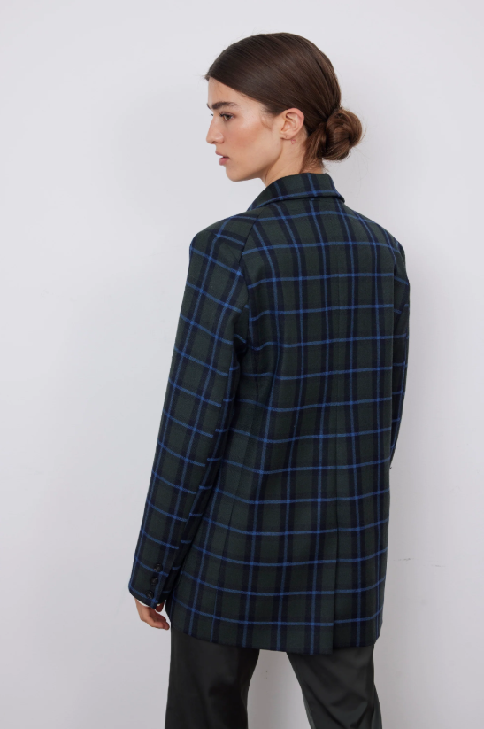Blazer cuadros verde y azul, tejido sarga de corte recto con detalle de bolsillos.