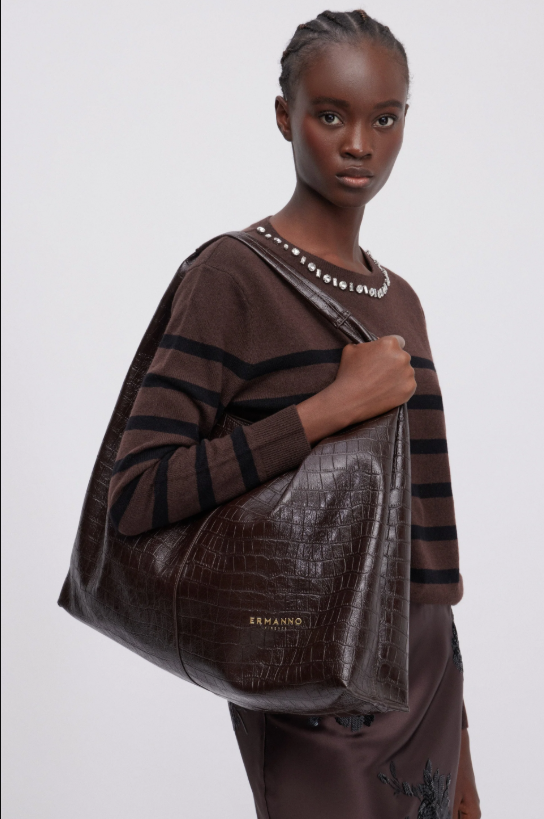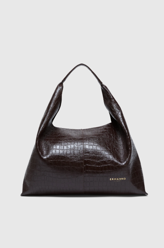 Maxi bolso hobo negro con estampado Coco en piel sintética, de textura suave y desestructurada, ideal para un estilo contemporáneo e informal. Amplio bolso con forro de ante y bolsillo interior abierto. Cierre central con cremallera metálica y un pequeño logo dorado en un lateral.
