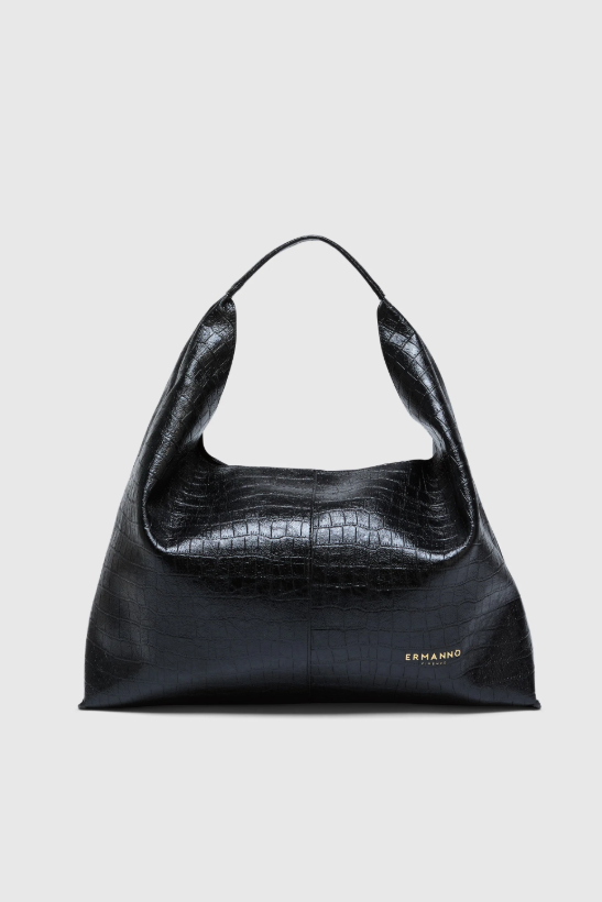 Maxi bolso hobo negro con estampado Coco en piel sintética, de textura suave y desestructurada, ideal para un estilo contemporáneo e informal. Amplio bolso con forro de ante y bolsillo interior abierto. Cierre central con cremallera metálica y un pequeño logo dorado en un lateral.
