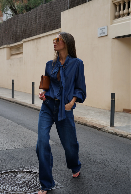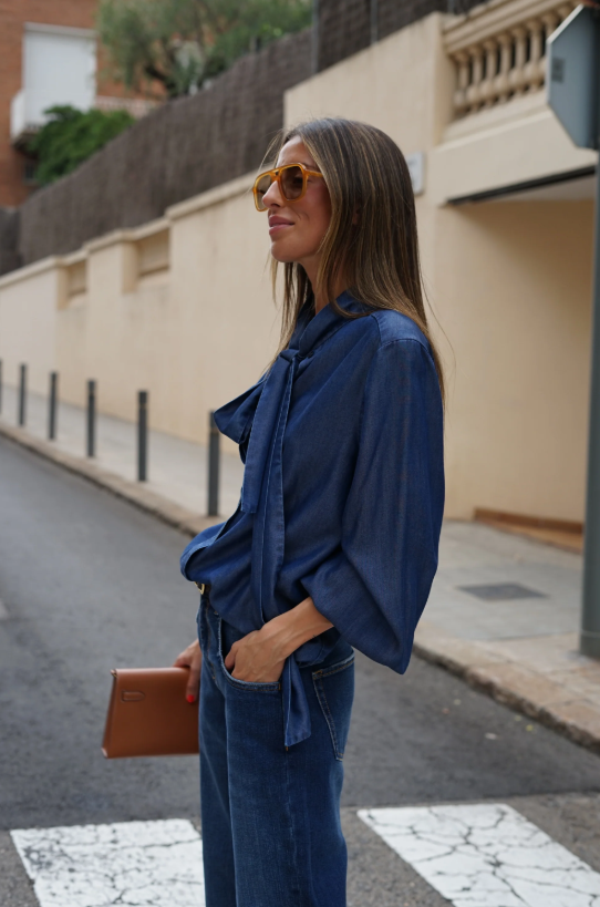 Blusa de tejido fluido con lazada en el cuello, confeccionada en poliéster reciclado, perfecta para un look elegante y consciente.