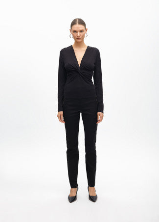 Camiseta de punto con detalle de nudo en la parte delantera. Manga larga ajustada y escote en pico profundo que añade un toque elegante. Material suave y elástico para un ajuste cómodo. Logotipo metálico discreto en la parte trasera.