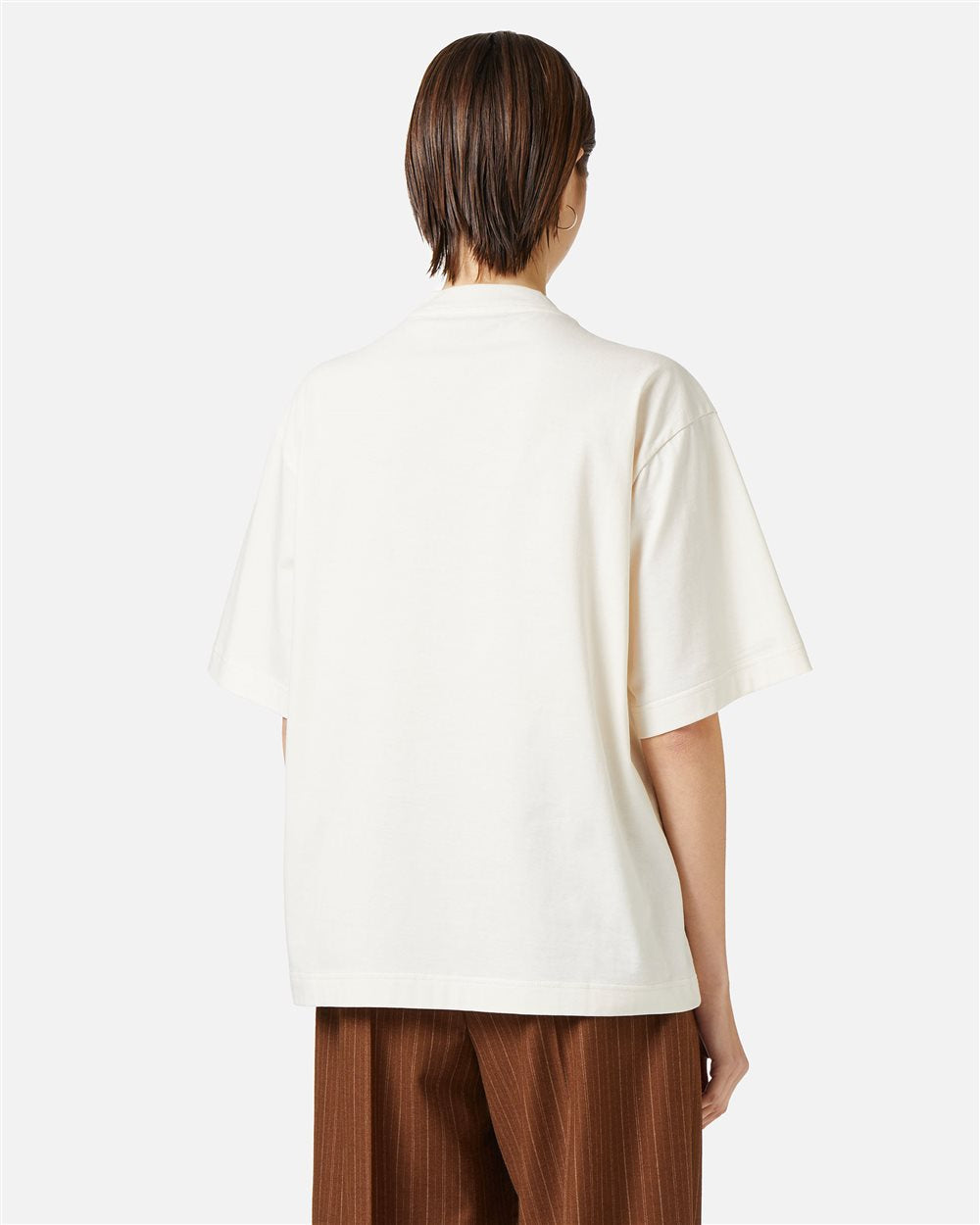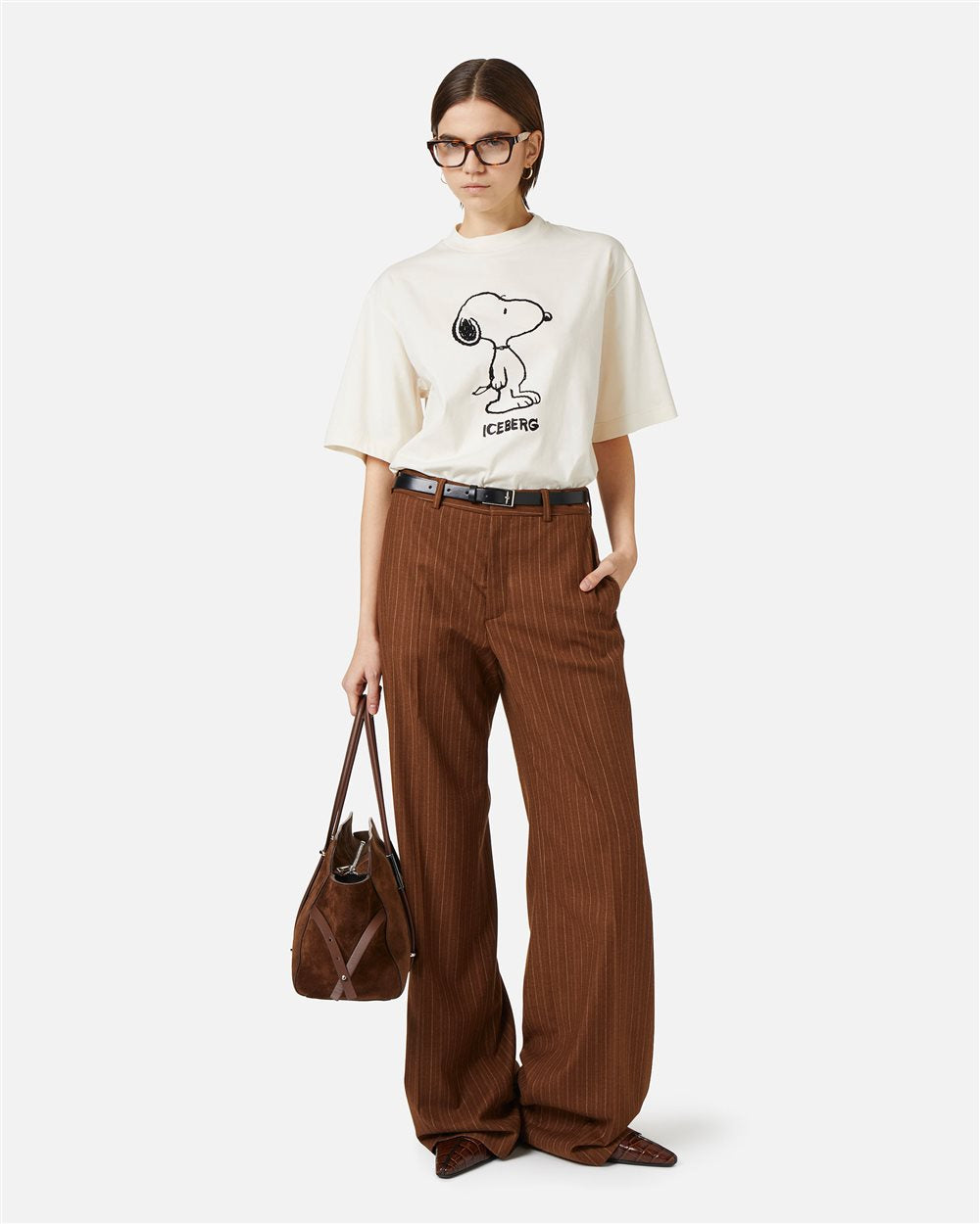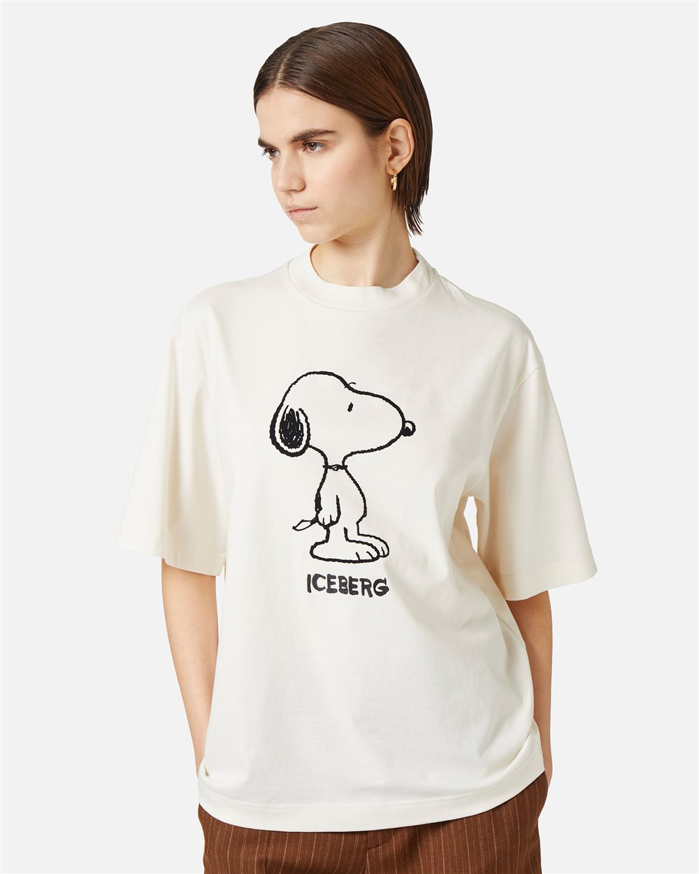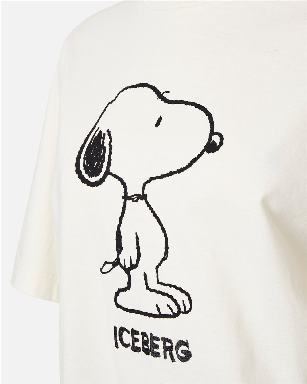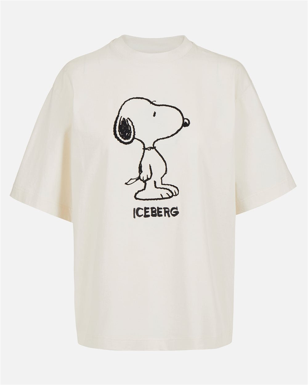 Esta camiseta holgada color vainilla combina líneas suaves y un estilo narrativo. Confeccionada en jersey fijo de tacto compacto, presenta un aplique de tela en contraste con el personaje de Snoopy en la parte delantera, acompañado del logotipo de Iceberg bordado. Una prenda que combina la cultura pop con el cuidado de la sastrería, perfecta para añadir un toque divertido a un armario con un toque gráfico y contemporáneo.