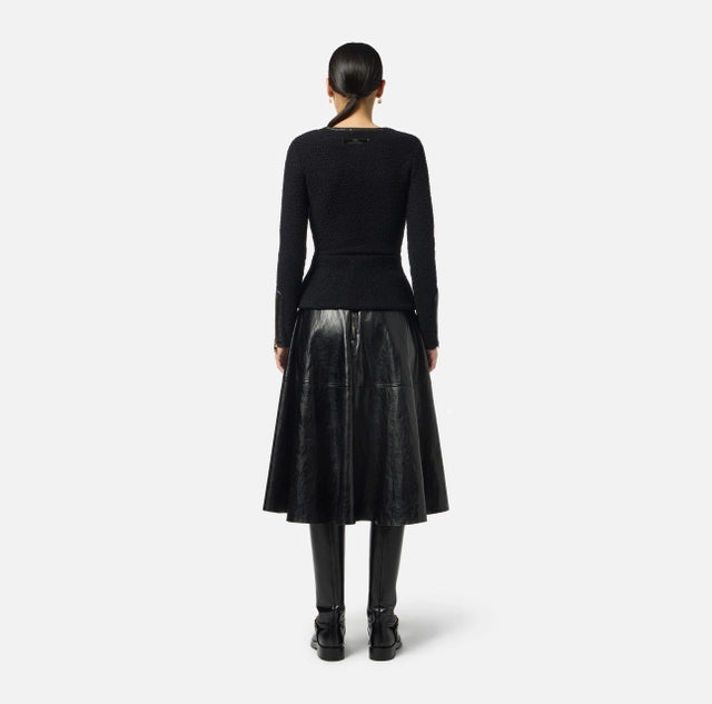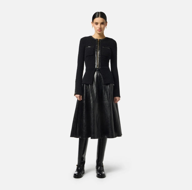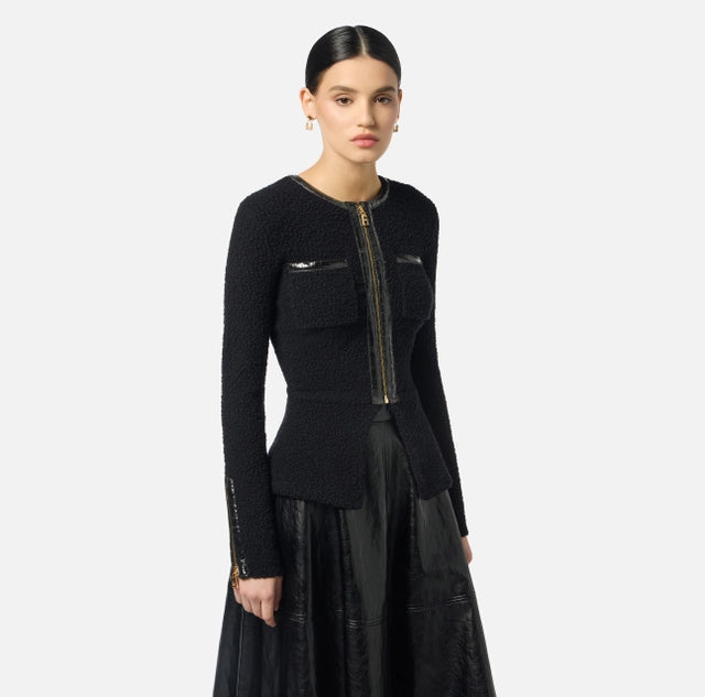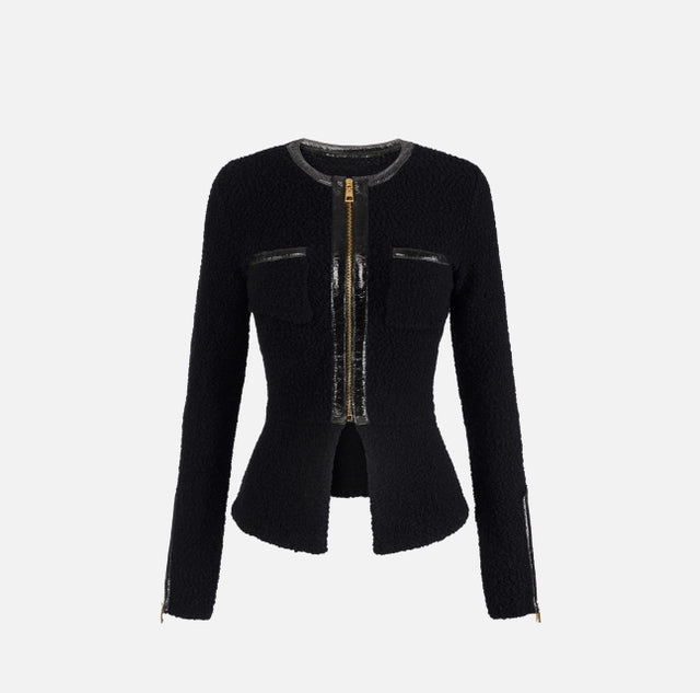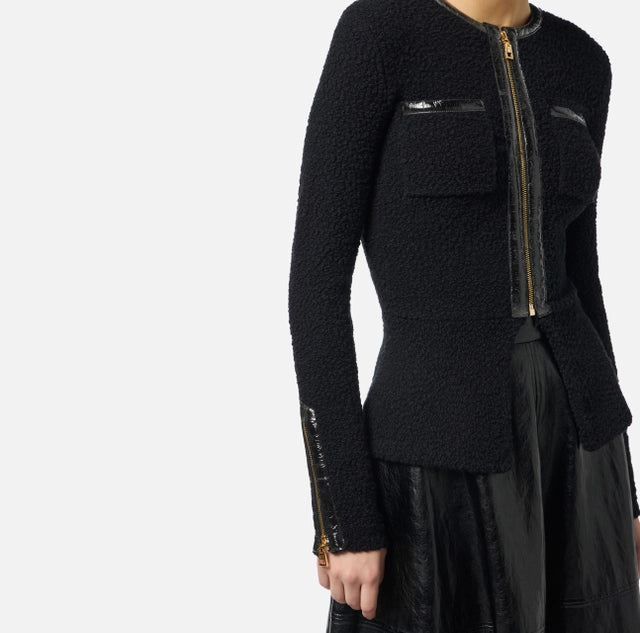Cárdigan de punto bouclé de talla adherente. Los detalles de vinilo y la cremallera de metal dorado iluminan el busto y las mangas para crear distintivos contrastes de texturas. El faldón marca la cintura y crea juegos de cortes especiales. Etiqueta con logotipo en la espalda.