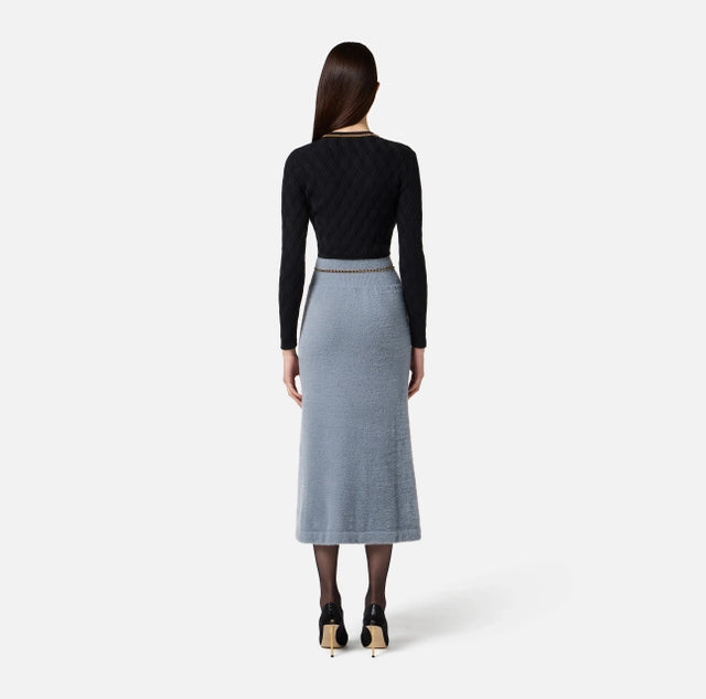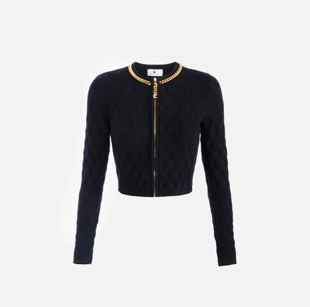 Cárdigan de punto de talla adherente. Presenta cuello redondo y mangas largas y se distingue por el sofisticado tejido 3D que crea un diseño geométrico de rombos a lo largo de toda la prenda. Es adornado con una cadena de corte diamante y presenta un cuello con cremallera y tirador joya con logotipo.