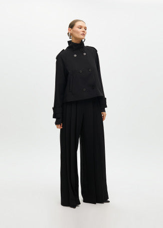 Chaqueta corta confeccionada en tejido premium con detalle plisado en la espalda. Diseño cruzado con botones y hombreras. Ideal para combinar con pantalones holgados.