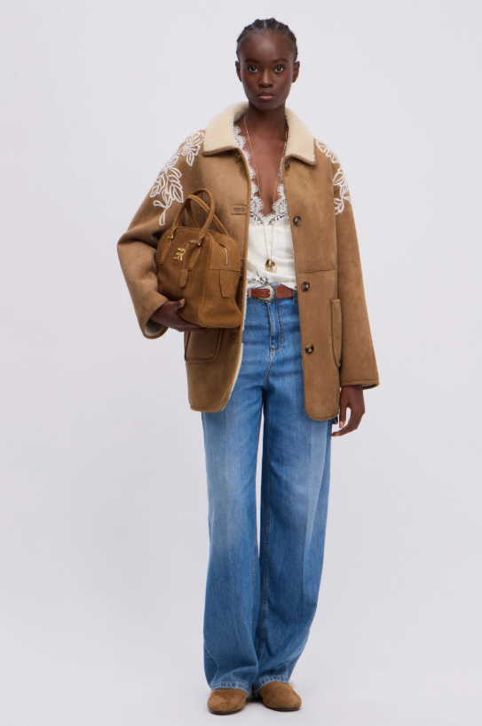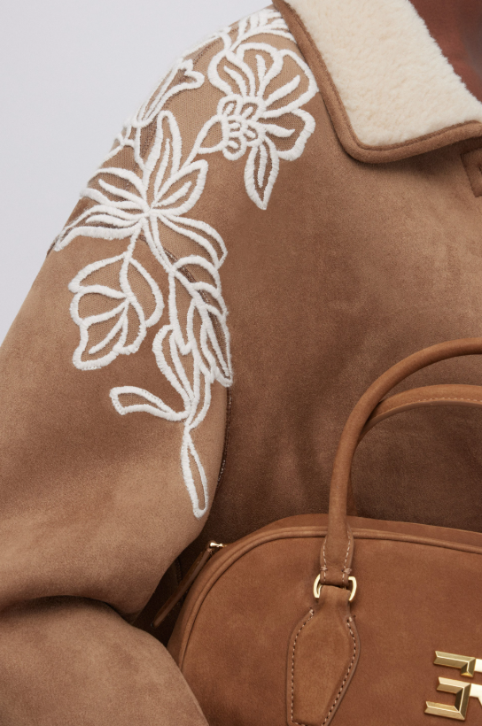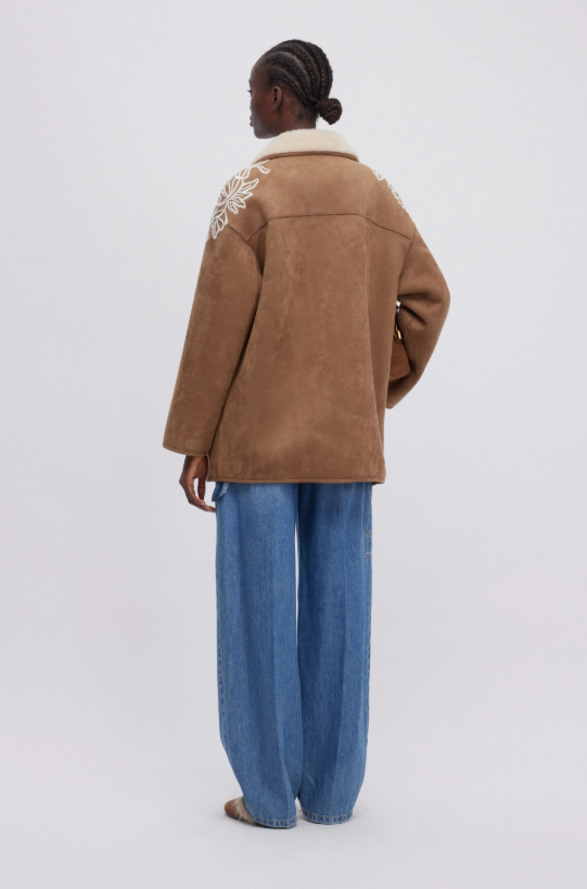 Chaqueta de ante sintético de oveja color camel con cuello y forro de suave piel sintética en color crudo. La prenda está adornada con un bordado de lana en la manga. Bolsillos de parche delanteros.