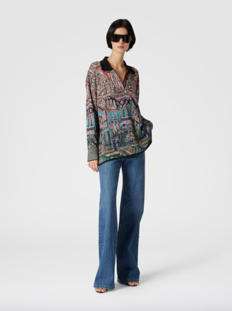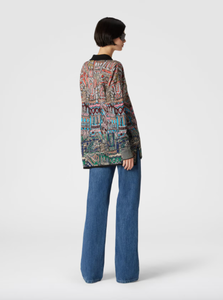 En el pantalón vaquero de cinco bolsillos, la lona vaquera adquiere una connotación sartorial gracias a su diseño impecable y a la adición de un toque al más puro estilo Missoni: la aplicación de punto con motivo de flauta, que se hace eco del botón personalizado.