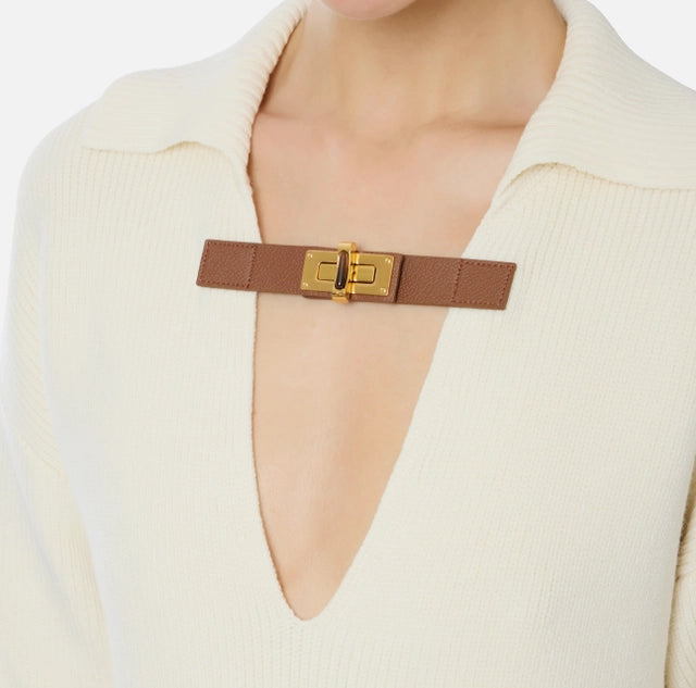 Jersey de mezcla de lana de talla regular. Presenta un cuello con amplio escote pico y es adornado con una correa con cierre de giro de metal dorado, con encima un detalle color ámbar efecto carey. Acabado de canalé en los bordes y las aberturas laterales.