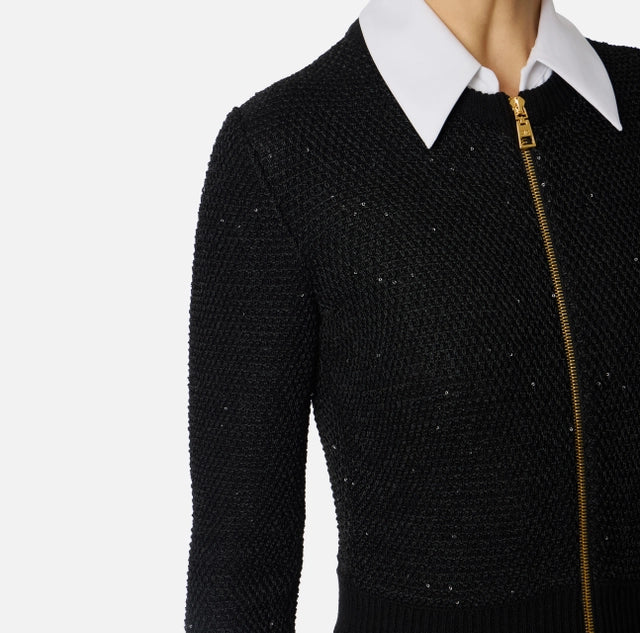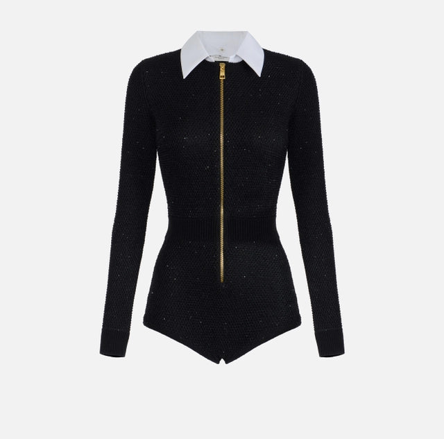 Mono de punto de talla adherente. Se caracteriza por la textura de las lentejuelas que aportan reflejos preciosos. Presenta cintura con acabado de canalé y cuello camisero realizado de popelina, desmontable para aumentar las opciones de styling. La cremallera de metal dorado añade un toque final de luz.