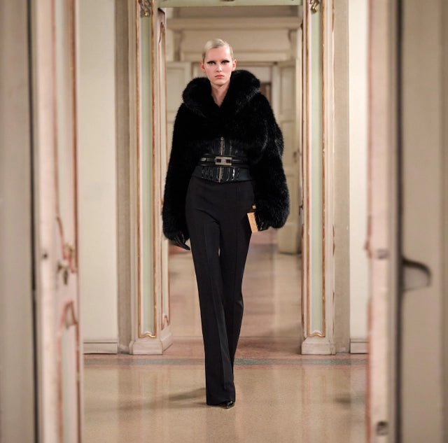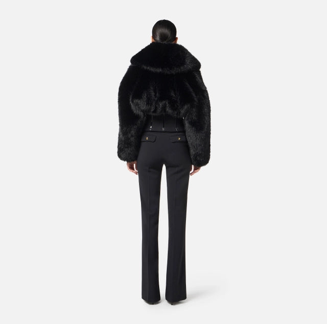 Pantalón de crepé ligero de talla adherente con pernera levemente evasé en el tobillo. Se caracteriza por el cinturón que adorna la cintura, realizado de cadena con logotipo y borla colgante. En la parte trasera presenta solapas de parche con botones esmaltados y diseño de inspiración snake.