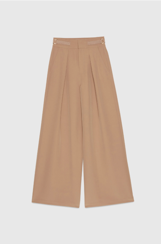 Pantalones anchos de cady con pliegues delanteros y cinturilla con detalles de tiras. Bragueta con cremallera y cierre de corchete oculto, y bolsillos traseros falsos. Cómodo y de corte amplio.