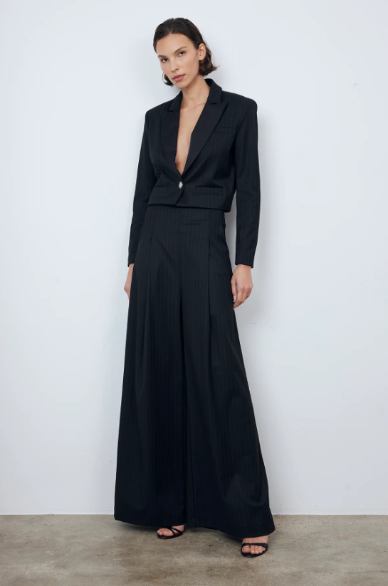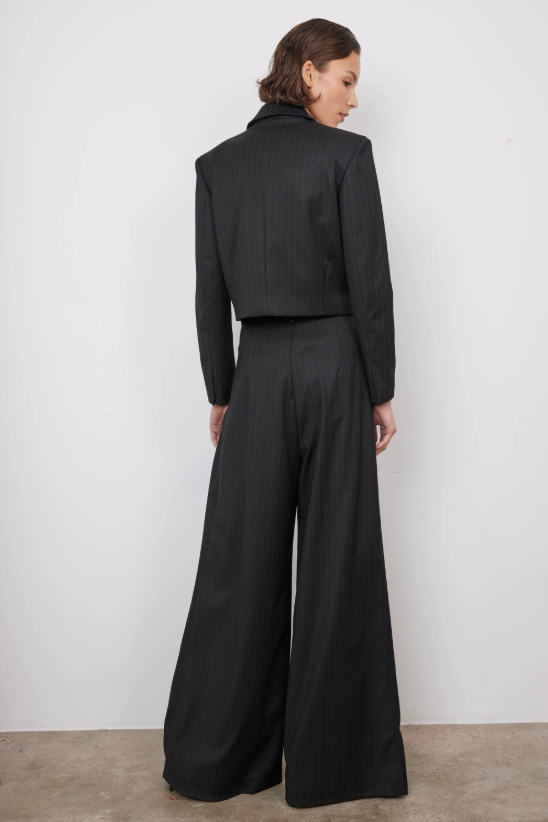 Pantalón de tiro alto con gran volumen en la pierna y tejido de raya pequeña, ideal para un look sofisticado con personalidad.