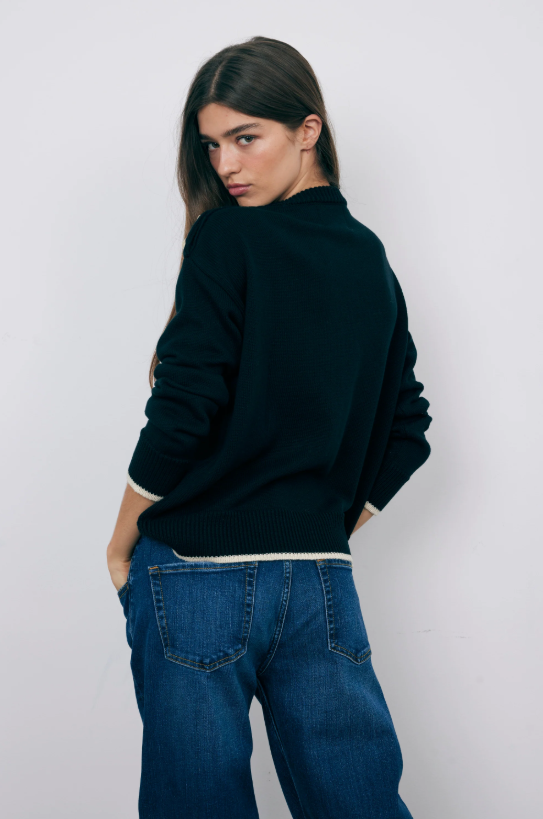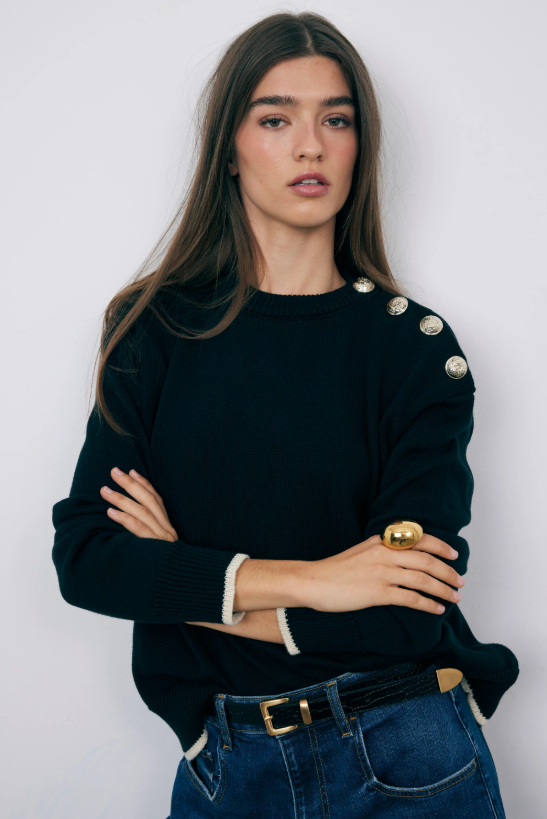 Jersey en mezcla de lana con cuello redondo, botones joya en el hombro y puños a contraste, una prenda con detalles que elevan cualquier look.