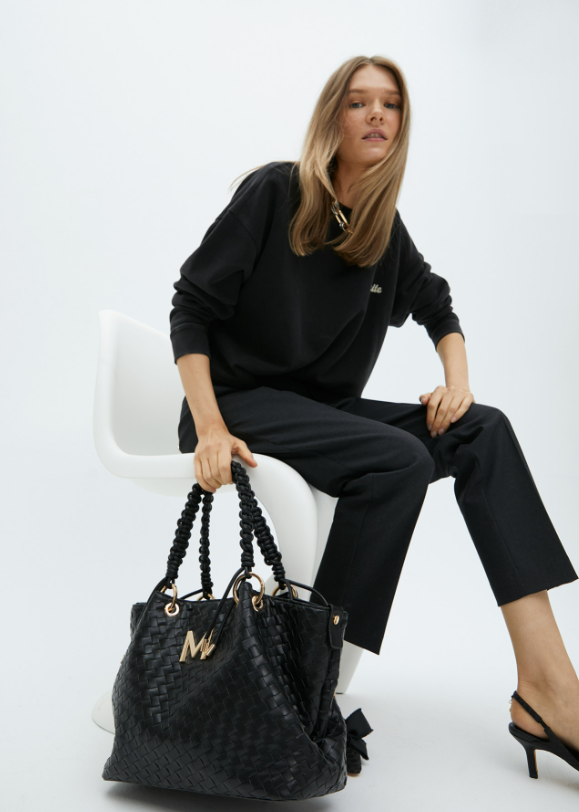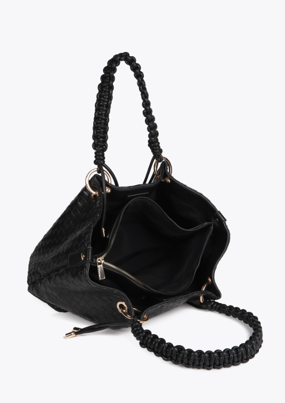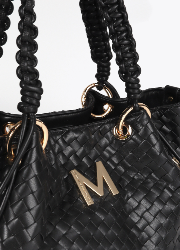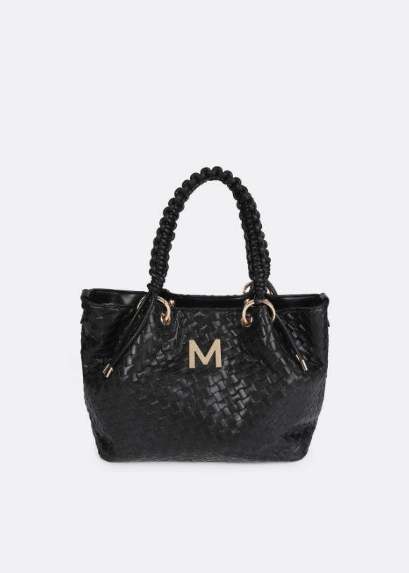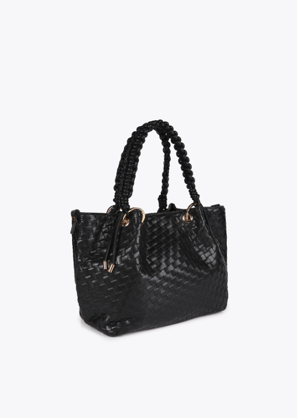Elegante shopper confeccionado en material trenzado con efecto piel. Amplio interior con cierre de cremallera y asa doble trenzada para un cómodo transporte. Detalle de logo frontal en metal dorado.