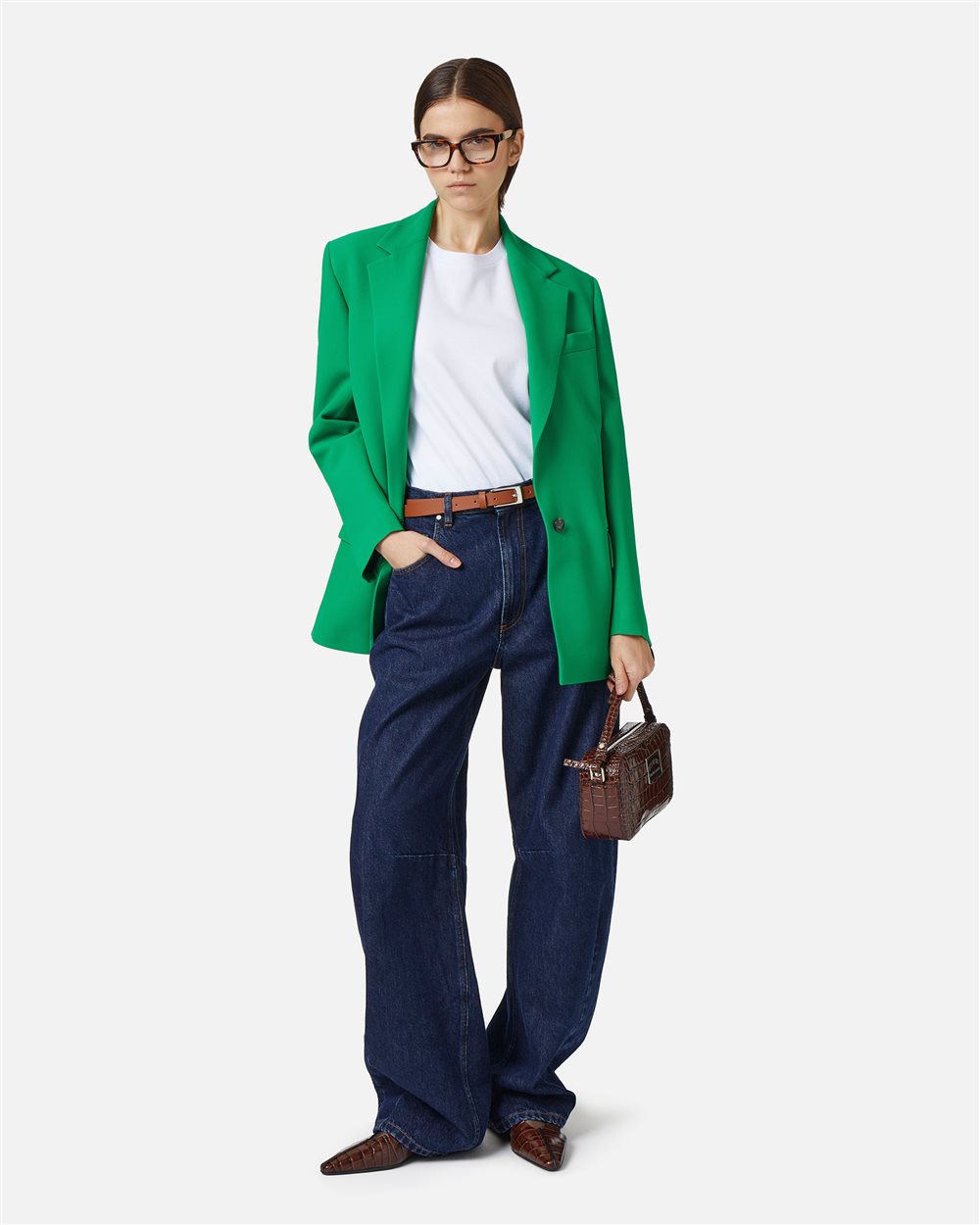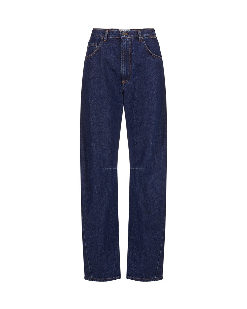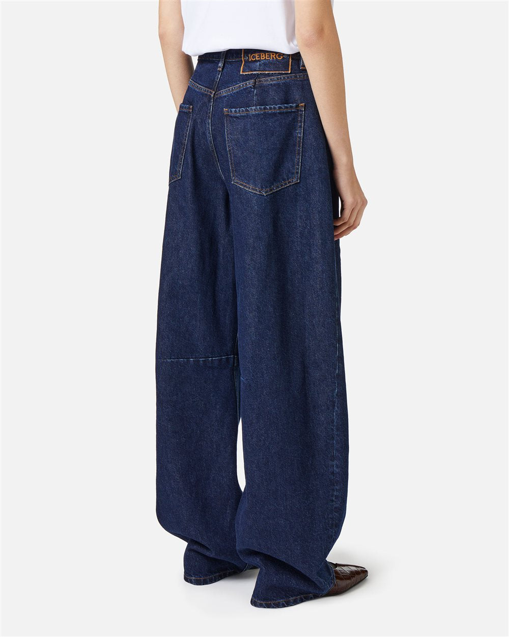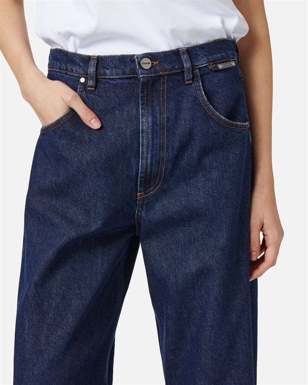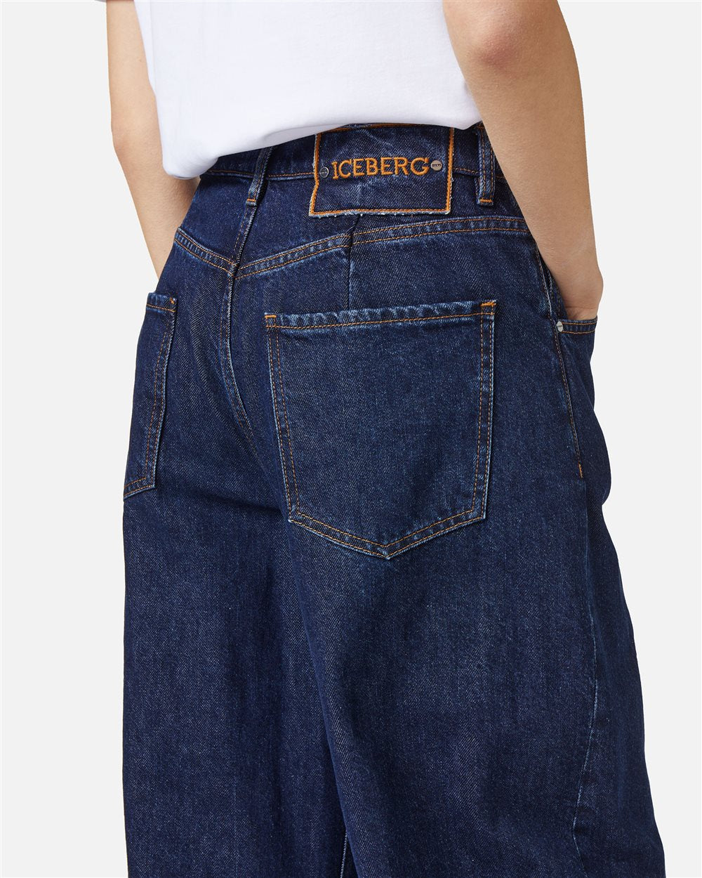 Cinco bolsillos en denim azul índigo con un corte moderno y lavado crudo oscuro. Acabado con una etiqueta Iceberg bordada en la espalda con hilo koban y una placa metálica con el logotipo en el lateral.