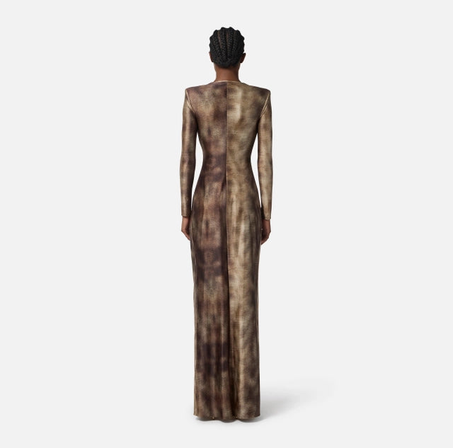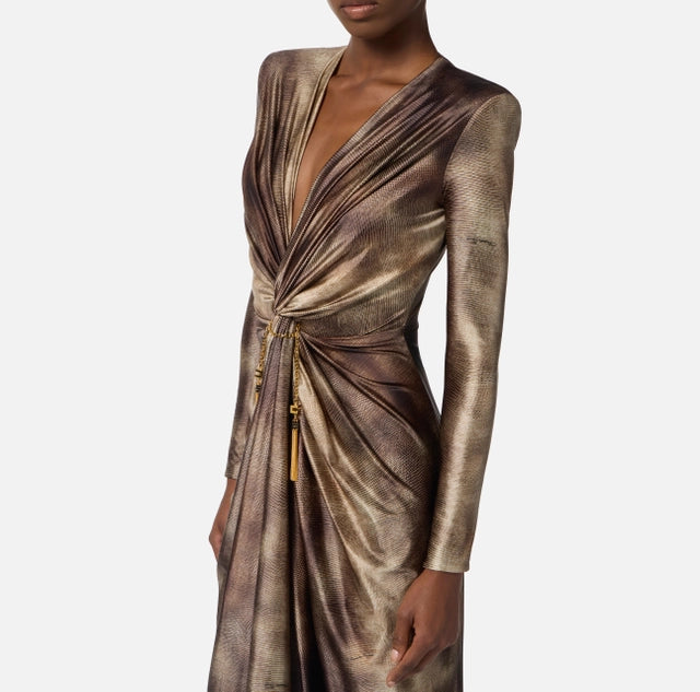 Vestido de noche de licra de talla adherente. El vestido presenta hombros estructurados y se caracteriza por el nudo central adornado con el detalle joya desmontable, de cadena y con borlas en trama snake. El protagonista es el estampado con motivo pitón, afinado por tonos hipnóticos. Abertura delantera.